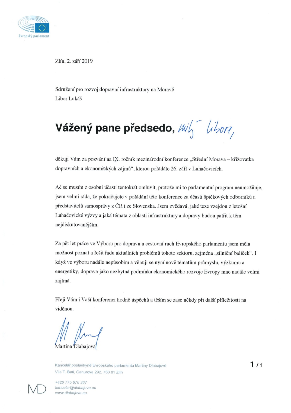 Europoslankyně paní Martina Dlabajová neváhala a i přes svou pracovní zaneprázdněnost, související s náročnou funkcí ve výboru pro průmysl, výzkum a energetiku evropského parlamentu, vyjádřila písemně svou podporu již IX.ročníku konference v Luhačovicích