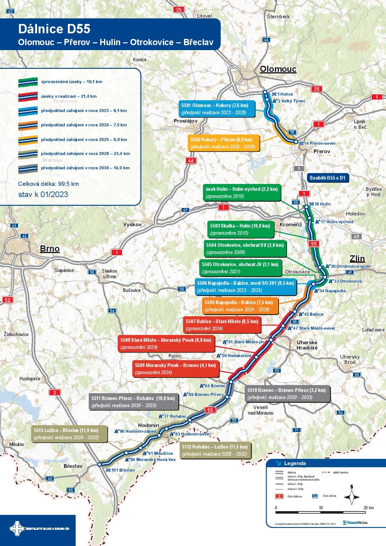 Dálnice D55 mezi Olomoucí a Břeclaví je plánována již od roku 1963. Stokilometrová trasa, která by měla v celé své délce v průběhu následujících deseti let plně nahradit dopravně přetíženou silnici I. třídy I/55 je důležitou dopravní tepnou zejména pro řidiče z Olomouckého, Zlínského a Jihomoravského kraje.