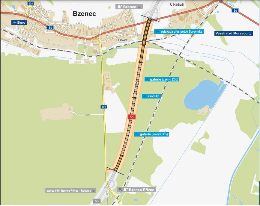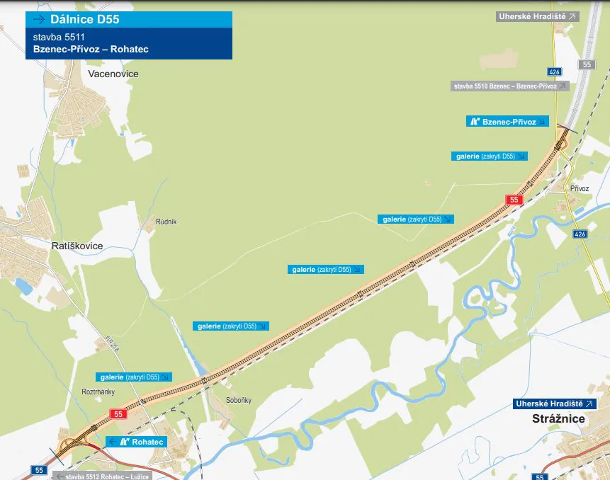 Ředitelství silnic a dálnic (ŘSD) pokročilo s přípravami dvou nejproblematičtějších úseků dálnice D55. Uzavřelo dvě smlouvy na projektanty pro zpracování dokumentace pro společné povolení na úseky 5510 a 5511 mezi Bzencem a Rohatcem. Zakázky v obou případech získalo sdružení firem HBH Projekt, Sagasta, GEOtest a Link projekt. Vyplývá to z informací v registru smluv.