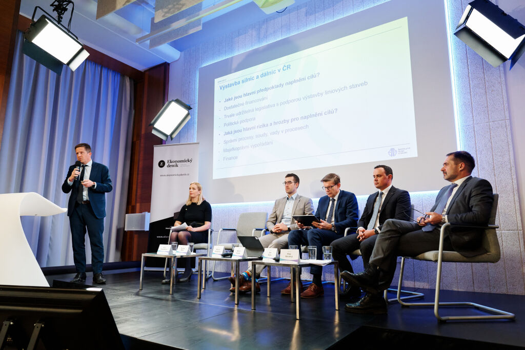 na snímku generální ředitel Ředitelství silnic a dálnic Radek Mátl, zleva pak šéfredaktorka České justice Eva Paseková, předseda představenstva a generální ředitel Českých drah Michal Krapinec, ministr dopravy Martin Kupka, partner advokátní kanceláře Portos Jan Sůra a partner poradenské společnosti PwC Petr Smutný. Foto: Radek Čepelák