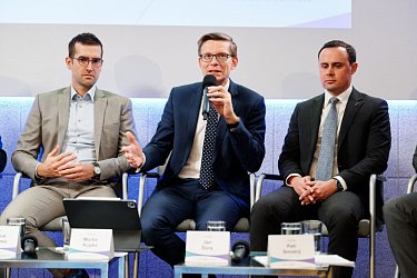 snímku zleva předseda představenstva a generální ředitel Českých drah Michal Krapinec, ministr dopravy Martin Kupka a partner advokátní kanceláře Portos Jan Sůra. Foto: Radek Čepelák